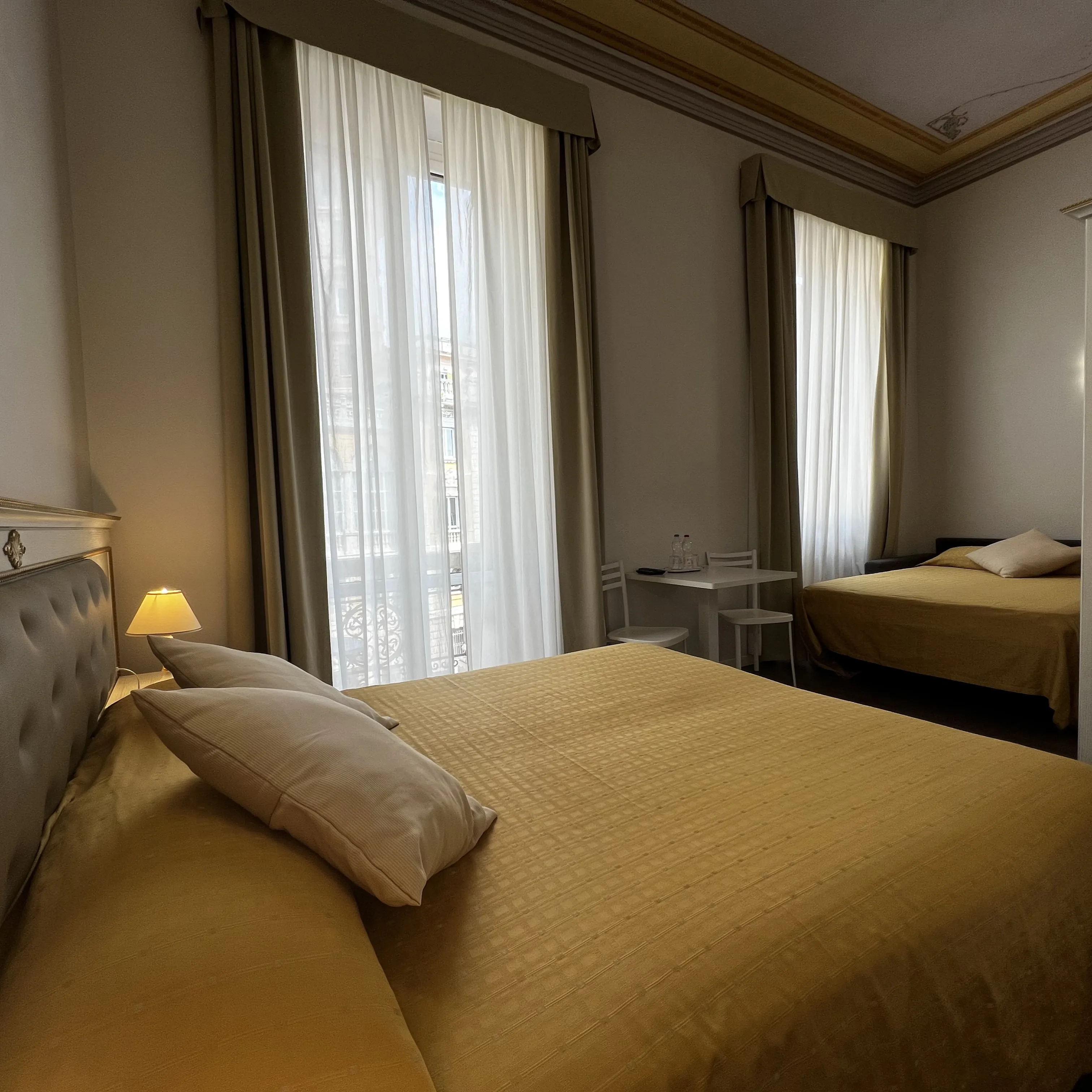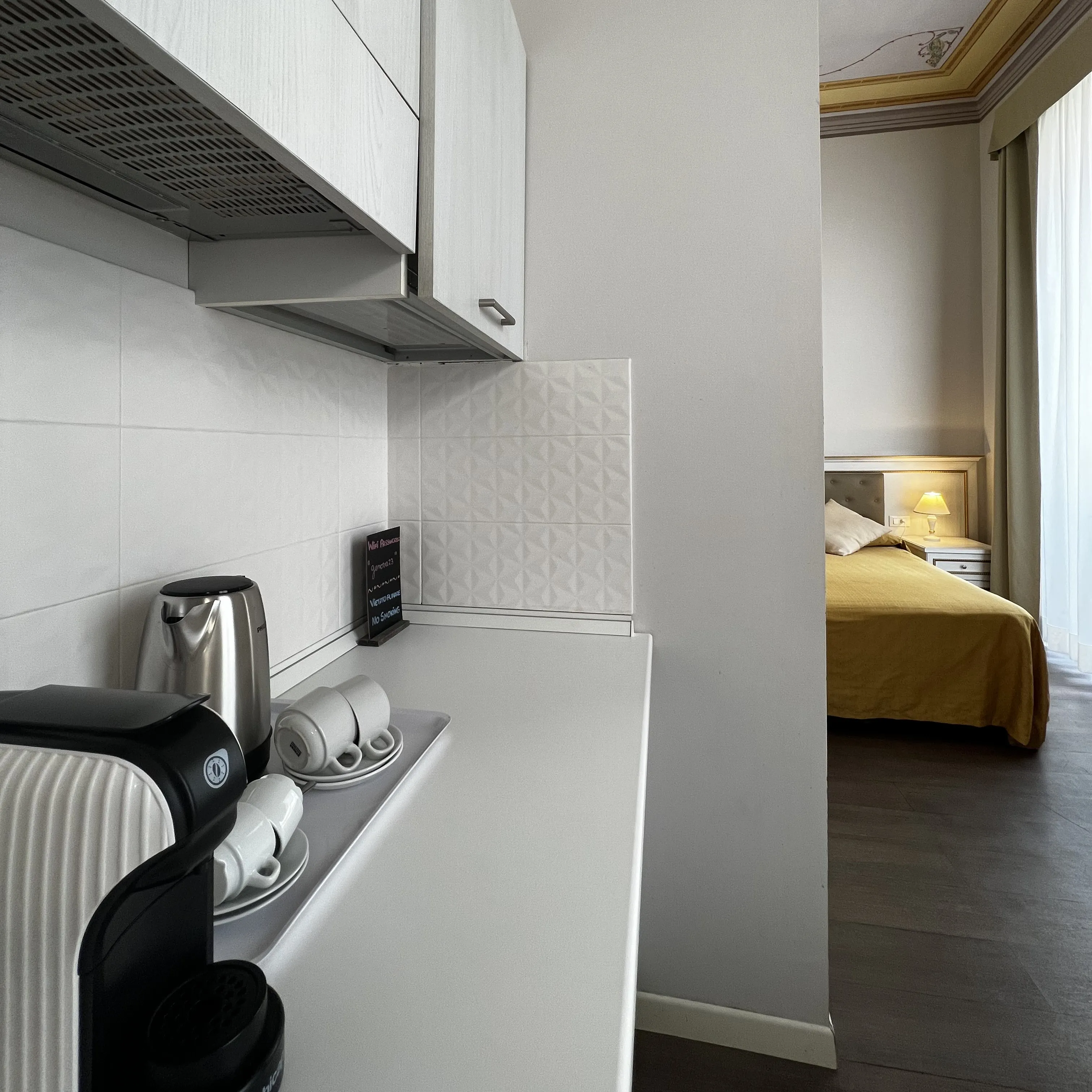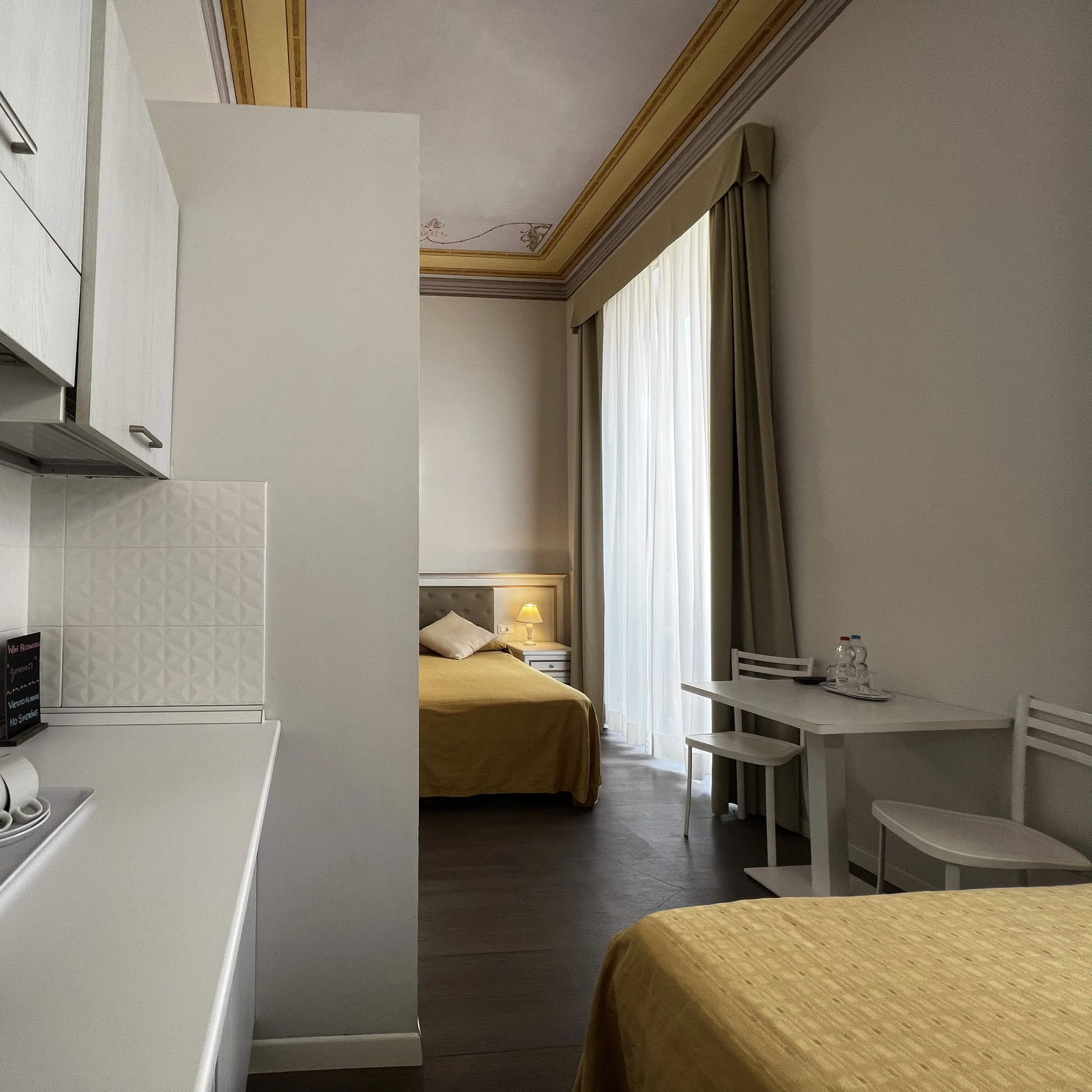 Le Family Studio présente une décoration élégante et dispose d'équipements supplémentaires pour un séjour confortable, comme un balcon, une bouilloire électrique et une cafetière. Les fenêtres donnent sur la célèbre rue piétonne San Vincenzo pour les promenades. La chambre dispose d'une salle de bains avec une douche, bidet et toilettes. Le Studio Monolocale ou Familial est équipé d'un grand lit et d'un canapé. Sur demande, un lit bébé peut être ajouté moyennant un supplément. La chambre mesure 21 m².